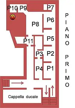 - P2: Zweites Vorzimmer, auch Zimmer der Kavaliere genannt. Auf der linken Seite liegen die Zimmer, in denen die adligen Damen untergebracht waren, die der Herzogin dienten. An der Gewölbedecke gibt es ein Fresko, auf dem der „Wagen der Morgenröte“ abgebildet ist. Seconda anticamera, conosciuta anche come camera dei cavalieri.
