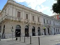 - Im Erdgeschoss zeigen sie glattes Bossenwerk oberhalb des glatten Sockels. Die Reihe von Rundbogenportalen sind mit Bossenwerk gerahmt, das in Diamantenform angeordnet wurde. Das Hauptportal zum Corso Giuseppe Garibaldi wird von zwei Säulen mit ionischen Kapitellen flankiert, die die Konsolen des Mittelbalkons im Obergeschoss stützen. Dagegen gehört das Portal an der Fassade zur Via Cattolica dei Greci zum Palast der Familie Arcovito aus dem 17. Jahrhundert und unterscheidet sich in seinen architektonischen Linien vom vorgenannten.