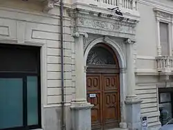 - Das Obergeschoss, das mit einer Reihe von großen Lisenen mit ionischen Kapitellen versehen ist, die die Fassade vertikal aufteilen, zeigt eine Reihe von Balkonen, zwei davon an den Ecken, die mit Geländern mit kleinen Säulen geschlossen, mit dekorierten Konsolen gestützt und mit Fenstertüren versehen sind, deren Architrave mit floralen Motiven dekoriert und von Lisenen begrenzt sind, die die oben erwähnten bereichern, die an derselben Fassade zu sehen sind. Dies alles krönt ein reiches Gebälk, auf dem ein vorspringendes Untertraufgesims mit kleinen, behauenen Konsolen, einer dekorierten Balustrade, bereichert von verschiedenen architektonischen Elementen, ruht.