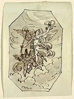 Achteckige Zeichnung eines Gemäldes im Palazzo Morri: Fama mit zwei Putten