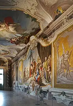 Von der Bibliothek gelangt man in den Blauen oder Baldachinsaal. Die Renaissance-Fresken (1558–1560, Giovanni da Udine) seines baldachinartigen Deckengewölbes stellen Szenen aus dem Neuen Testament dar. Im 2. Stockwerk sind auch der Thronsaal und die Kapelle, deren Altarbild zeigt eine Madonna mit Kind von Jacopo Palma dem Jüngeren. Im Deckenfresko des Gerichtssaales ist das Urteil Salomons (G. B. Tiepolo, 1729) dargestellt. Der Freskenzyklus mit biblischen Szenen von Tiepolo in der Galleria wird von der Darstellung: Rachel versteckt die Hausgötter vor ihrem Vater Laban (1727), beherrscht.
