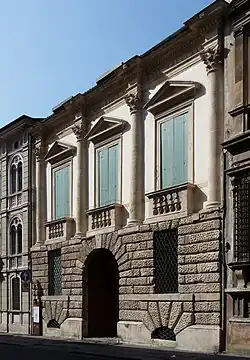Die repräsentative Fassade des Gebäudes ist genau wie Straße relativ schmal. Das piano nobile ist in drei Joche gleicher Breite gegliedert, die durch vier korinthische Halbsäulen gerahmt werden. Zwischen den Säulen befinden sich rechteckige Fenster mit einem Balkon, die von einer Balustrade begrenzt werden. Jedes Fenster wird durch einen Dreiecksgiebel bekrönt. Die Wand des oberen Geschosses ist glatt verputzt. Wie die Schemazeichnungen von Ottavio Bertotti Scamozzi zeigen, befanden sich über den Dreiecksgiebeln insgesamt drei Mezzaninfenster, die in den Architrav einschnitten und die dahinterliegenden Räume belichteten.