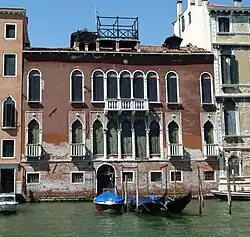 Das dunkelrot gestrichene Gebäude ist eine Mischung aus Gotik und Renaissance (daher vermutlich aus dem 15. Jahrhundert) und unter allen Palästen zwischen dem Rio San Polo und dem Rio di San Tomà ist er der niedrigste. Das Erdgeschoss hat kein Mezzaningeschoss und zurzeit auch keinen Anstrich. Dort findet sich ein Portal zum Wasser mit bescheidenen Dimensionen, das nicht in der Mitte des Gebäudes liegt, sondern nach links verschoben ist. (Vielleicht ist es nur das verbleibende Teil eines Portalpaares, dessen anderer Teil zwischenzeitlich zugemauert wurde.)