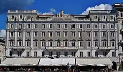 Das Aussehen der Hauptfassade zur Piazza dell’Unità d’Italia ist das Resultat des Umbaus durch Eugenio Geiringer und Giovanni Righetti ab 1872: Im zweiten und dritten Obergeschoss werden die Seitenflügel durch vier kannelierte Lisenen betont, die in ionischen Kapitellen gipfeln, wogegen im obersten Geschoss die Lisenen Platz für florale Verzierungen lassen. Eine Festondekoration gibt es auch am Dachgesims über dem fünften Stockwerk. Oben auf den Seitenflügeln sind in den Raum zwischen den Fenstern vier Statuen eingesetzt, die klassische Gottheiten zeigen. Sowohl der Mittelbau als auch die Seitenflügel werden durch marmorne Balustraden gekrönt, die das Motiv der kleinen Balkone im zweiten Obergeschoss wiederaufnehmen.[1][4]