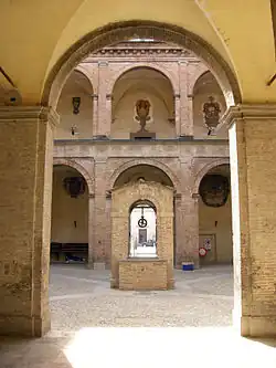 Das klassische Beispiel eines Renaissancegebäudes hat einen quadratischen Grundriss und einen Innenhof, der durch eine dreifache Vorhalle mit zwei Säulenreihen begrenzt wird.
