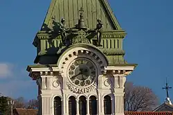 In der Mitte der Fassade erhebt sich der Uhrenturm, auf dessen Spitze sich die Statuen von zwei Mohren befinden, die die Stundenschläge auf eine Glocke schlagen. Die beiden Skulpturen, die mit den Spitznamen „Micheze“ und „Jacheze“ (aus dem Slowenischen „Mihec“ und „Jakec“) belegt wurden, wurden dort nach dem Willen von Bruni aufgestellt, in Erinnerung an die beiden Mohren, die die Stundenschläge auf der Spitze des Torre di Mandracchio oder Uhrenturms schlugen, der einst das Eingangstor zum Hafen bildete und 1838 abgerissen wurde. Die originalen Statuen wurden in Bronze vom Bildhauer Fausto Asteo da Ceneda geschaffen und zwischen 5. und 7. Januar 1876 auf der Spitze des Turms installiert; sie traten zur Mittagsstunde des 14. Januar 1876 erstmalig in Aktion. 1972 wurden die Statuen entfernt und durch Kopien ersetzt, damit die Originale nicht verschlissen. Letztere wurden bis 2004 in einem Lager verwahrt, bis sie schließlich restauriert und am Eingang des Castello di San Giusto aufgestellt wurden.[1][5][8][7]