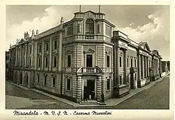 1947 verkaufte die staatliche Liegenschaftsverwaltung ein Kompendium der ehemaligen Kaserne, bestehend aus einer alten, halb zerstörten Gymnastikhalle, einem alten Schuppen und einem Innenhof, an die Pfarrgemeinde in Mirandola, damit diese daraus ein gemeindliches Oratorium mache. Die Entscheidung der Kirchengemeinde, aus der ehemaligen Gymnastikhalle ein Kino zu machen, rief zahlreiche Kontroversen von Seiten der damaligen Mitglieder der kommunistischen Partei hervor, darunter des ehrenwerten Oreste Gelmini, der sich um einen Parlamentssitz bewarb.[4]