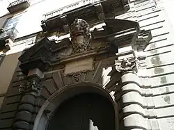 Das Portal, das vollständig in der Zusammenstellung der Fassade zentriert ist, ist durch typische Elemente des späten Manierismus gekennzeichnet, wie z. B. die Verwendung einer Wandverkleidung aus Bossenwerk; die Halbsäulen zeigen Quadertrommeln unterschiedlicher Größe, während die Kapitelle aus weißem Marmor ionisch im Stil Michelangelos sind. Auf dem Schlussstein wurde eine Steintafel ohne Spur irgendeiner Beschriftung angebracht, über der sich das Familienwappen, gerahmt von einem gebrochenen Rundbogengiebel, befindet.
