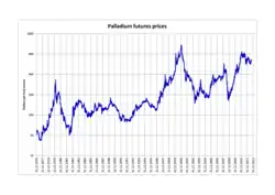 Mit der allgemeinen Rohstoffhausse stieg der Palladiumpreis wieder kontinuierlich und erreichte am 4. März 2008 einen Höchststand von 595,10 US-Dollar pro Feinunze. Im Zuge der Finanzkrise ab 2007 fiel der Preis deutlich. Am 5. Dezember 2008 notierte der Kurs auf einem Tiefststand von 161,00 US-Dollar. Die Krise hatte sämtliche Anlageklassen abstürzen lassen. Danach blieb die Preisentwicklung volatil. Am 21. Februar 2011 wurde für den Palladium-Future ein Preis von 863,70 US-Dollar ermittelt. Acht Monate später, am 5. Oktober 2011, stand der Palladiumpreis bei 537,30 US-Dollar.
