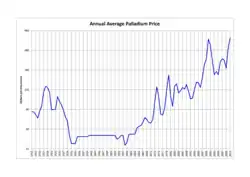 Im Dezember 2019 wurde Palladium erstmals für über 2.000 US-Dollar pro Feinunze gehandelt.[9] Am 17. Januar 2020 überschritt der Preis für eine Feinunze erstmals die Marke von 2.500 US-Dollar, was auf Angebotsknappheit zurückgeführt wurde.[10]