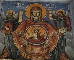Die Panagia ist eine Variante der Muttergottes vom Zeichen (Platytera). Sie wird frontal mit oder ohne Jesuskind dargestellt und ist von Engeln und Heiligen umgeben.[2]
