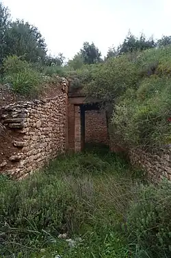 Der Torweg (Stomion) wurde aus akkurat behauenen Steinquadern aus Konglomerat, die nicht gesägt, sondern nur mit dem Hammer zugerichtet wurden, errichtet. Die Decke des Stomions wurde von zwei Decksteine aus Konglomerat gebildet. Diese haben Kerben, an denen vermutlich bei dem Verlegen der Steine Seile befestigt wurden, um die Ausrichtung zu erleichtern. Links und rechts des Eingangs wurde zwei rechteckige Pilaster aus Poros errichtet. Sie enden unter dem äußeren Deckstein, der etwas hervorkragt, und bilden mit ihm einen Rahmen um den Eingang. Über dem Stomion gibt es ein Entlastungsdreieck, das die Last des darüberliegenden Gesteins auf die Seitenwände ableitet und so die Decksteine entlastet. Das Entlastungsdreieck war mit einer Fassade aus rechteckigen Porosquadern verkleidet.