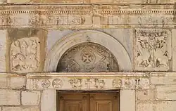 - Westseite, über dem Eingangsportal: vier Reliefplatten mit Sphingen und Greifen, die nach Michel/Struck Seitenplatten byzantinischer Brunnen waren;[3] eine der Platten mit dem Greifenmotiv besitzt ein sehr ähnliches Pendant an der Fassade der Kirche von San Marco, Venedig.