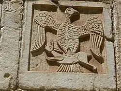 - Südseite: Byzantinische Brunnenplatte mit dem Motiv des Adlers, der einen Hasen in gestrecktem Lauf ergreift.[9]