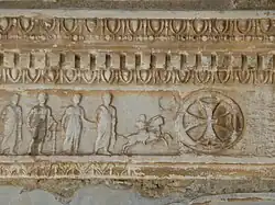 - Ostseite: Marmorquader mit einem archaischen Fries; dargestellt ist ein Trauerzug für die Gefallenen einer Schlacht.