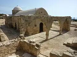 Die Panagia Katholiki (auch Panagía Chrysopolítissa oder Afrodítissa) entstand im 12. Jahrhundert auf kreuzförmigem Grundriss mit einer Kuppel über der Vierung. Sie schließt im Osten mit einer Halbkreisapsis und ist tonnengewölbt. Die Kirche steht östlich des Aphrodite-Heiligtums und enthält einige Spolien aus dem benachbarten Tempel. Auf der Nordseite befindet sich ein Wasserspeier in Form eines Wildschweins. Bei Seuchen und Dürren ist die Kirche von Schnüren umgeben. Der auf dem Heidnischen basierende Brauch, der von der zyprischen Kirche geduldet wird, soll das Sakrale vom Profanen trennen und den bösen Geist vertreiben.