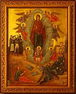Eine Ikone im Innern der Kirche erinnert an eine angebliche Begebenheit im Zweiten Weltkrieg. Die Wehrmacht verfolgte am 10. September 1943 eine Gruppe griechischer Widerstandskämpfer, die sich im Kloster Panagia von Skripou versteckten. Als sich deutsche Panzer Orchomenos näherten setzte ein starker Herbstregen ein und weichte den Boden so stark auf, dass die Panzer stecken blieben. Nachdem der Regen nachgelassen hatte, versuchte man die Panzer wieder aus dem Morast zu befreien. Es begann jedoch erneut zu regnen und die Jungfrau Maria erschien über der Kuppel der Klosterkirche. Vor Ehrfurcht zogen sich die deutschen Truppen wieder nach Levadia zurück und verschonten Orchomenos.