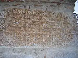Die Hauptinschrift verläuft in einer Zeile um die Außenwand der Apsis und ist in acht längliche Steine gemeißelt, die nebeneinander angeordnet sind: