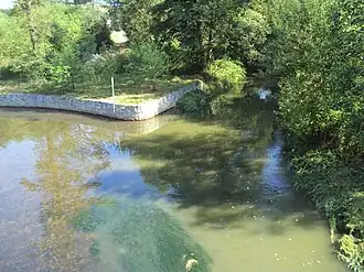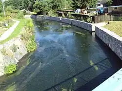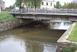 ![]() Blick von der Schlossbrücke in Mimoň zur Mündung des Panenský potok (links) in die Ploučnice | ||