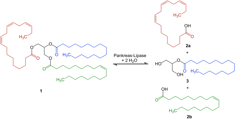 Die Pankreas-Lipase spaltet bei Triglyceriden – z. B. 1 – nur die α-ständigen Fettsäurereste ab.[8] Dabei bilden sich die freien Fettsäuren 2a und 2b sowie das Monoglycerid 3:[9]