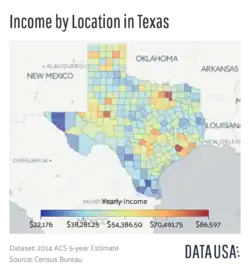 Laut Quickfacts-Infos auf census.gov betrug das Medianeinkommen pro Haushalt 50.712 US-Dollar (USD).[10] Die ermittelten Medianwerte liegen nahe an denen des Bundesstaats Texas sowie der USA insgesamt.[11] Als Personen, die in Armut leben, wies der Zensus 15,6 % aus, als Personen ohne Krankenversicherung 17,5 %.[10]