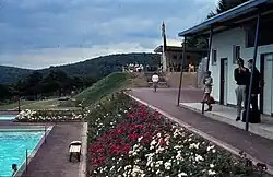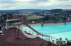 Durch die Zunahme des wirtschaftlichen Wohlstandes nach dem Ende des Zweiten Weltkrieges und die steigende Zahl von Urlaubsgästen entstand der Wunsch nach einem neuen Schwimmbad mit dem Komfort der damaligen Zeit. Daher kam eine Ertüchtigung des verfallenen Bades im Warmsrother Grund nicht mehr in Frage. Die Wahl des Grundstückes fiel auf ein Wiesengelände oberhalb der Stadt am südlichen Waldrand, sodass neben einer Fernsicht auch die volle Sonneneinstrahlung von morgens bis in die Dämmerung gewährleistet werden konnte.[10] Am 14. Dezember 1959 erfolgte der erste Spatenstich zur Erschließung des Geländes.[11] Nach Baukosten von 575.745 DM konnte das neu erbaute Höhenfreibad mit „hochmodernen hygienischen und schwimmsporttechnischen Errungenschaften“ am 14. Juli 1962 eingeweiht werden.[12] Die Anlage bestand aus einem Schwimmer- und Nichtwimmerbecken mit jeweils 50 Metern Länge, Sprungtürmen (1 und 3 Meter), Rutsche und Kinderbecken. Oberhalb der Liegewiesen befand sich auf einem aufgeschütteten Plateau eine Kleingaststätte mit Fernsicht. Umkleideräume, Büro, Kasse und sanitäre Anlagen waren in einem länglichen Flachbau, die technischen Betriebsräume im seitlich unterkellerten Schwimmbecken untergebracht. Das Schwimmbad wurde mit dem Petunia-Verfahren betrieben, nach welchem Flussgewässer genutzt und aufbereitet werden, um in verschiedenen Stufen, „Schwimmwasser“ herzustellen. Dazu nutzte man das ca. 27 °C warme Wasser des Warmen Brunnens im Tal unterhalb des Gollenfelsens in der Staatsstraße, an dem sich eigens für das Schwimmbad eine Pumpstation befand. Über eine ca. 500 m lange Leitung wurde das Wasser nach oben zum Bad gepumpt, um in den Schwimmbecken eine ausreichende und beständige Wassertemperatur halten zu können. Nach einigen Probejahren erwies sich diese Lösung als unzureichend, daher baute man 1969 eine elektrische Wasserbeheizungsanlage ein, die eine Dauertemperatur von 23 °C ermöglichte und war das erste beheizte Freibad im Kreis Bad Kreuznach.[13]