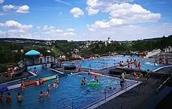 Das beheizbare Schwimmbad, welches 2011 eröffnete, ist in insgesamt sechs Bereiche gegliedert: ein 25 Meter langes Schwimmbecken, das ganzjährig geöffnete Wellnessbecken, ein Sprungbecken mit zwei Sprungtürmen (1 und 3 Meter Höhe), ferner jeweils ein Lehr-, Kinder- und Erlebnisbecken. Im Randbereich befindet sich eine 60 Meter lange Wasserrutsche, die teils unterirdisch verläuft. Insgesamt beträgt die Wasserfläche 624 m². Ganzjährig werden zwei finnische Saunen und eine Wärmehalle mit Zugang zum Wellnessbecken betrieben. Im weitläufigen Außenbereich (37.148 m²) mit Fernblick sind terrassierte Liegewiesen, Beachvolleyballfeld und ein abgeschirmter FKK-Bereich angelegt.[1] Besuchern steht im Gastronomiebereich ein Bistro mit Aussichtsterrasse, das auch ohne Schwimmbadbesuch von außen zugänglich ist, zur Verfügung. Kostenfrei nutzbare Parkplätze sind direkt am Bad vorhanden.