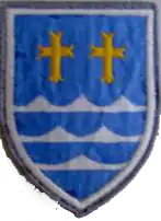 - Silbern bordiert, in Blau zwei goldene Kreuze über drei silbernen Wellenfäden im Schildfuß.