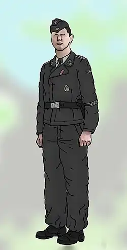 Am 12. November 1934 wurde für die Panzerbesatzungen ein schwarzer Feldanzug mit rosa Vorstößen eingeführt: Die hüftlange Feldjacke wurde vorn übereinandergeschlagen und auf der rechten Seite zugeknöpft. Der große Umschlagkragen mündete vorn in einem tiefen Revers, die beiden Brustklappen wurden ausgeschlagen, konnten bei Kälte aber auch vollständig geschlossen werden. Die rosa Paspelierung des Kragens verschwand um 1942, gleichzeitig wurde der Kragen etwas kleiner und die Jacke etwas kürzer.