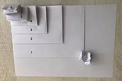 Briefpapier im Format DIN A4 wird in der geschäftlichen Korrespondenz zweimal waagrecht gefaltet und in einem DL-Briefumschlag versandt. Wird ein Kuvert mit Adressfenster (links unten) verwendet, so gibt es nach DIN 5008 für die Höhe des Briefkopfs und die daran anschließenden Lage des Adressfelds zwei Varianten (A und B) und entsprechend tiefer liegende zwei Falzmarken. Die obere liegt demnach 87 bzw. 105 mm vom oberen Papierrand entfernt, die untere 105 mm tiefer.[1] Es kann zuerst das untere (ungefähre) Drittel des Briefs nach vorne und oben und dann die doppelte Lage gegenüber dem oberen Drittel nach hinten gefalzt werden, wodurch eine zick-zack-förmiger Faltung entsteht und der Briefkopf sichtbar bleibt.