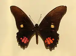 Die Flügelspannweite der Falter beträgt 70 bis 100 Millimeter.[1] Alle Flügel haben eine schwarzgraue bis tiefschwarze Grundfarbe. Der Apex ist spitz und leicht nach außen gebogen. Auf der Oberseite der Vorderflügel befindet sich bei einigen Exemplaren ein milchig weißer Fleck. Arttypisch ist ein großer hellroter bis rubinroter Fleck auf der Oberseite der Hinterflügel nahe am Tornus, der von schwarzen Adern durchzogen ist. Die Art wird deshalb im englischen Sprachgebrauch als Ruby-spotted Swallowtail oder Red-spotted Swallowtail bezeichnet. Aufgrund der markanten Zeichnungselemente ist die Art unverwechselbar. Die Hinterflügel sind gekerbt, es fehlen jedoch die für diese Gattung meist typischen Schwänzchen. Die Flügelunterseiten entsprechen farblich den Oberseiten, sind jedoch etwas blasser gefärbt.