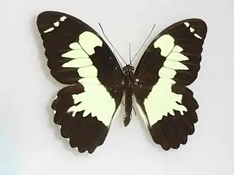 Die Falter erreichen eine Flügelspannweite von 100 bis 130 Millimetern. Die Vorderflügel haben eine schwarze Grundfärbung. In der unteren Hälfte des Mittelteils verläuft eine gelbe Binde, durch welche jedoch schwarze Adern verlaufen. Zwischen dem Ende dieser Binde und dem Vorderrand befindet sich in der Diskalregion ein sehr großer Bogenfleck. Wenige Zentimeter vom Apex entfernt befinden sich vom Vorderrand bis zum Außenrand drei verhältnismäßig kleine gelbe Flecke. Die Hinterflügel haben ebenfalls eine schwarze Grundfärbung und weisen im mittleren Teil des Flügels als Fortsetzung der Binde des Vorderflügels eine gelbe Binde auf. Der Außenrand hat keinen Schwanzfortsatz.[1]
