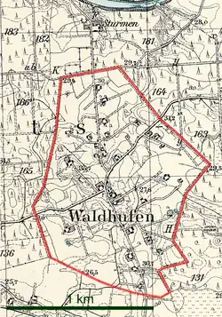 Die Gemeinde Waldhufen auf einem Messtischblatt von 1936. Auch die Försterei Sturmen (oben) gehörte (als Exklave) zu dieser Gemeinde.
