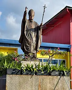 Osttimor befand sich zwischen 1975 und 1999 unter indonesischer Besatzung. Infolge der Okkupation kamen fast 200.000 Menschen ums Leben (etwa ein Fünftel der Bevölkerung). Die römisch-katholische Kirche in Osttimor unterstützte die Timoresen in ihrem Unabhängigkeitsbestreben und gewann dadurch an Sympathie in der Bevölkerung. Von etwa 30 Prozent[2] stieg der Anteil der Katholiken in der Bevölkerung bis 1990 auf etwa 80 %.[3] 1989 besuchte Papst Johannes Paul II. Osttimor. Allgemein hatte Johannes Paul II. erklärt, dies sei ein pastoraler, aber kein politischer Besuch. Als er aus dem Flugzeug stieg, hatte er nicht den Boden geküsst, wie er es zu tun pflegte, wenn er ein neues Land betrat. Bei Beginn seiner Messe vor 100.000 Zuschauern in Tasitolu kniete Johannes Paul II. aber nieder und küsste ein Kruzifix, das auf einem Kissen auf dem Boden lag. Auch wenn ein Vatikansprecher dies als normalen Teil der Messe bezeichnete, sahen einige darin eine Anerkennung Osttimors. Die Zuschauer konnten aus ihrer Position das Kruzifix nicht erkennen, so dass die Menschenmenge jubelte, als der Papst wieder aufstand.[4] Zudem nutzten Unabhängigkeitsaktivisten die Anwesenheit der internationalen Presse um Transparente zu entfalten, die für die Selbstbestimmung Osttimors warben und gegen Menschenrechtsverletzungen protestierten.[5][6] Seit dem Besuch wird Johannes Paul II. sehr verehrt. Eine sechs Meter hohe Statue erinnert in Tasitolu an ihm und unter anderem ist eine Universität, die Universidade Católica Timorense São João Paulo II., nach Johannes Paul II. benannt.