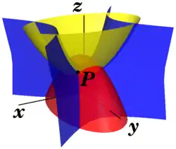 Die Paraboloid-Koordinaten (englisch paraboloidal coordinates [ 2] :664 [ 1] :44 ) sind die formale Erweiterung des Konzepts der konfokalen Parabeln der Ebene in den dreidimensionalen Raum, siehe Bild. Hier bestimmen die Schnittpunkte zweier elliptischer Paraboloide (gelb und rot) und eines hyperbolischen Paraboloids (blau) die Koordinaten eines Punktes (P im Bild).