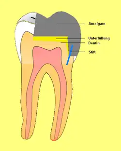 - Das Füllungsmaterial kann zerbrechen (zerbröseln), wenn die den Stift überdeckende Schicht des Füllungsmaterials keine ausreichende Stärke aufweist und der Stift einem Keil vergleichbar wirkt.