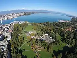 Das weitläufige Areal des Parks mit einer Fläche von 213'097 Quadratmetern (gut 21 Hektar) liegt südlich des Lac de Genève, wie die Genfer Bucht des Genfersees (Léman) auch genannt wird. Er erstreckt sich von der Seeuferstrasse, dem Quai Gustave-Ador (früher Quai des Eaux-Vives)[24] mit der darin einmündenden Quartierstrasse Rue des Eaux-Vives, etwa 600 Meter gegen Südosten bis an die Route de Frontenex. Die Villa La Grange befindet sich ungefähr in der Mitte des Areals, dessen nordwestlicher Bereich sich zum See hin senkt und eine weite Rasenfläche und den Rosengarten umfasst. Im Osten grenzt das Parkareal an das Gebiet von Genfs Nachbargemeinde Cologny.