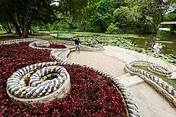 - Eine Bootsanlegestelle am Südrand des Sees wird durch eine ausladende zweiläufige Treppenanlage vom Beltwalk her erschlossen und von kräftig ausgebildeten Zement-Voluten gefasst, in die farbige Kiesel eingelassen sind.[9]