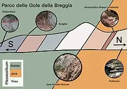 Im Laufe der Zeit hat der Fluss Breggia sich in die Schlucht eingegraben und dabei ein etwa 1,5 km langes geologisches Profil aus der Zeit des Erdmittelalters freigelegt.[4] In der Geologie werden die letzten 4450 Mio. Jahre in Erdaltertum (Paläozoikum), Erdmittelalter (Mesozoikum) und Erdneuzeit (Känozoikum) aufgeteilt, die wiederum in Epochen zerlegt werden.[5]:30 Das Erdmittelalter umfasst den Zeitraum vor 251 bis 65,5 Mio. Jahren, der wiederum in Trias, Jura und Kreide gegliedert ist.[6]:194