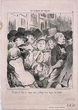 1855 gab es erstmals akkurate Zählungen der Salonbesucher, weil die Besucher durch am Eingang stehende Drehkreuze gehen mussten. 891.682 Personen besuchten 1855 die Ausstellung. 1876, dem letzten Jahr, für die genaue Zählungen vorliegen, betrug die Besucherzahl immer noch 518.892 Besucher.[22] Die Einführung von Eintrittspreisen im Jahre 1848 war wesentlich dafür verantwortlich, dass sich die Besucherzahlen verringerten und sich auch die soziale Zusammensetzung des Publikums veränderte. Nur noch an den traditionell eintrittsfreien Sonntagen kam es zu dem üblichen Gedränge.[23]