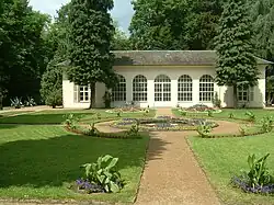 Im Eingangsbereich des Parks befindet sich ein Wirtschaftsgebäude (Küchenbau, 1781/83), das schon seit dem 18. Jahrhundert eine Gastwirtschaft mit einem Biergarten beherbergt. Das dahinter am Parkrand liegende Betriebsgebäude stammt aus dem Jahr 1960. Im nordöstlichen Parkbereich befinden sich die Orangerie (1784/85), der Speisesaal (1787/89) und der Tanzsaal (1801/02). Das Philosophenhaus, auch als Philosophenschule oder Philosophentempel bezeichnet, (1785/87) ist ein schlichter Bau über quadratischem Grundriss, mit an allen Seiten vorspringenden Risaliten, die von Dreiecksgiebeln bekrönt werden; das Zeltdach ist flach und schiefergedeckt. Durch seine Fensterchen sind auf Adlerkonsolen die Stuckbüsten von Philosophen zu erkennen, wie auch die kolossale Gruppe „Fortuna bei der Urne des Schicksals“ aus Stuckmarmor von Heinrich Philipp Sommer (aufgestellt 1811). Auf der Urne steht zu lesen: Fortuna favente sors iniqua mergitur. Salopp übertragen: Lacht dirs Glück, fällts Pech zurück. Allerdings fehlt über der Urne zwischen Daumen und Zeigefinger der sich gleichgültig abwendenden Fortuna das Pech, ursprünglich ein Würfel mit Fledermausflügeln.
