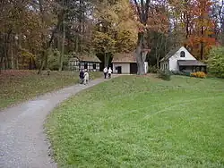 In die halboffene Landschaft kunstvoll einbezogen sind die Gebäude des Dörfchens (1788/89)[2], eine Gruppe kleiner Bauernhäuser, wie sie sich vergleichbar auch im Schlosspark Nymphenburg findet. Die Häuser wurden 1788 errichtet, das davon etwas abgerückte „Salettchen“ 1795/96. Eine weitere Gruppe von Hirtenhäusern wird die Wacht genannt und stammt von 1784/85. Vorbild für derartige Staffagen ist das Hameau im Park von Versailles.