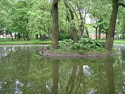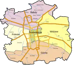- Der Fürst-Poniatowski-Park liegt zwischen den Straßen Parkowa, Mickiewicza, Włókniarzy und Żeromskiego und hat eine Fläche von etwa 41,2 Hektar. Angelegt wurde der Park 1904 bis 1910 als Ogrodu przy ul. Pańskiej (Garten bei der Pańskiejstraße, heute die Żeromskiego). Im Juli 1912 erließ der Stadtpräsident Łódźs eine Verfügung, die den Zutritt zum Park nur noch Offizieren, Beamten oder Personen mit einer Sondererlaubnis des Stadtpräsidenten erlaubt.[1] 1917 erhielt der Park seinen heutigen Namen. In den 1920er Jahren war die Villa im Park Sitz des Stadtpräsidenten. 1938 wurde ein Denkmal für Stanisław Moniuszko im Park errichtet, allerdings wurde dieses bereits ein Jahr später beim Einmarsch der Wehrmacht zerstört. Nach Ende des Weltkrieges wurden zwei Soldatenfriedhöfe der Roten Armee und der polnischen Kämpfer im Park angelegt. 1955 wurde ein Konzertplatz angelegt.