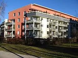 Wohngebäude an der Marianne-Brandt-Straße beherbergen 55 Wohnungen eines Pilotprojektes des Konzeptionellen Mietwohnungsbaus und 45 Wohnungen gemäß dem München-Modell-Miete, beziehungsweise München-Modell-Genossenschaft.[10] Der Konzeptionelle Mietwohnungsbau KMB enthält energetische, ökologische und wohnungspolitische Bestandteile und knüpft im Ausschreibungsverfahren die Grundstücksvergabe an ein überzeugendes Bewerberkonzept.