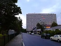 Im Südwesten, westlich der Drygalski-Allee, stehen zwei Punkthochhäuser, die als Max und Moritz bezeichnet werden. Sie wurden von den Architekten Jürgen von Gagern und Udo von der Mühlen geplant und gelten als herausragende Beispiele für einen gelungenen Hochhausbau.[11] Alle vier Seiten sind unterschiedlich gestaltet und die Fassaden durch teils tief eingezogene, teils auskragende Balkone gegliedert. Große Pflanztröge auf den Balkonen lassen die Süd- und Westseite grün wirken. Die Ausstattung war hochwertig, mit Fußboden- und Deckenheizung und raumhohen Fensterbändern, die aber durch die Balkone im Sommer beschattet werden.[12]