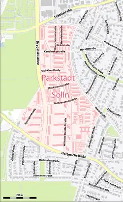 Die Parkstadt Solln umfasst etwa 400 ha[2], westlich an Alt-Solln angrenzend. Der Münchner Stadtrat beschloss den Bau im Juni 1964, Baubeginn war bereits 1965. Bauträger war Max W. Schlereth mit der DEBA.[3] Die Siedlung wurde auf bisherigen Äckern geplant und gebaut. Als Grenzen wurden die bestehenden Straßen Stäbli-, Welti- und Herterichstraße definiert.[4][5] Im Westen wurde eine neue vierspurige Hauptverkehrsstraße als Verbindung von der Boschetsrieder Straße zur Herterichstraße gebaut, die ursprünglich Würmseestraße nach dem alten Namen des Starnberger Sees heißen sollte, schließlich aber nach dem Forschungsreisenden Erich von Drygalski benannt wurde. Südlich der Herterichstraße sollten einige weitere Häuser und nach der ursprünglichen Planung auch die evangelische Kirche des Viertels entstehen. Beides wurde ebenso wenig realisiert wie die Fortführung der Drygalski-Allee bis zur Bundesstraße 11; ein halbes Jahrhundert später wurde dort ein großer Wohnblock errichtet. Das Gelände zwischen Hofbrunn- und Stäblistraße im Norden ist zwar im Bebauungsplanumgriff enthalten, es sind jedoch keine Änderungen in der bereits bestehenden Bebauung ausgewiesen. In der Planung ist die Hofbrunnstraße die nördliche Grenze des Neubaugebiets.[6]