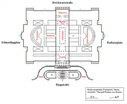 Der Sitz des Reichsrates hatte zwei deutlich voneinander abgesetzte Hälften, die der damaligen Gliederung des Reichsrates in Herrenhaus und Abgeordnetenhaus entsprachen; ursprünglich waren sogar zwei separate Gebäude vorgesehen gewesen. Der offizielle Name war „k.k. Reichratsgebäude“, der Name „Parlament“ war aber schon von Anfang an in Gebrauch.