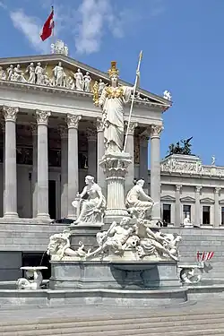 Der von Theophil von Hansen entworfene Pallas-Athene-Brunnen vor dem Parlament wurde erst 1898 bis 1902 erbaut, obwohl die Pläne schon seit 1870 bestanden. Die Figuren, eine vier Meter hohe Pallas Athene, Allegorien der gesetzgebenden und der vollziehenden Gewalt, sowie der vier wichtigsten Flüsse Altösterreichs – Donau, Inn, Elbe und Moldau – wurden von den Bildhauern Hugo Haerdtl, Josef Tautenhayn und Carl Kundmann geschaffen. Dass Pallas Athene, die griechische Göttin der Weisheit, dem Parlamentsgebäude den Rücken zukehrt, führte im österreichischen Volksmund zu verschiedenen Witzen und Spottworten, wonach die Weisheit nicht im Parlament anzutreffen sei.[19]