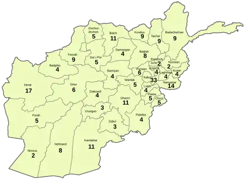 Die Wolesi Dschirga umfasst 250 Abgeordnete. 10 Abgeordnetensitze sind für Nomaden, die Kutschi, reserviert und ein weiterer Sitz für die Sikh- und Hindu-Gemeinschaft in Afghanistan. Die 239 in den Provinzen gewählten Abgeordneten verteilen sich auf die Provinzen wie folgt:[5]