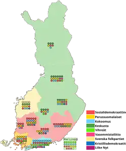 Die Finnische Zentrumspartei (KESK) des Ministerpräsidenten Juha Sipilä büßte über sieben Prozentpunkte ein und erreichte mit 13,8 Prozent das schlechteste Ergebnis seit 1917. Der Grüne Bund (VIHR) gewann an Stimmen hinzu (11,5 % nach 8,5 % bei der Wahl 2015). Die Gewinne und Verluste der übrigen Parteien waren marginal.